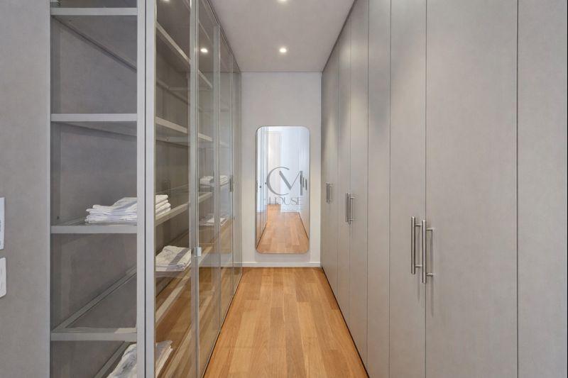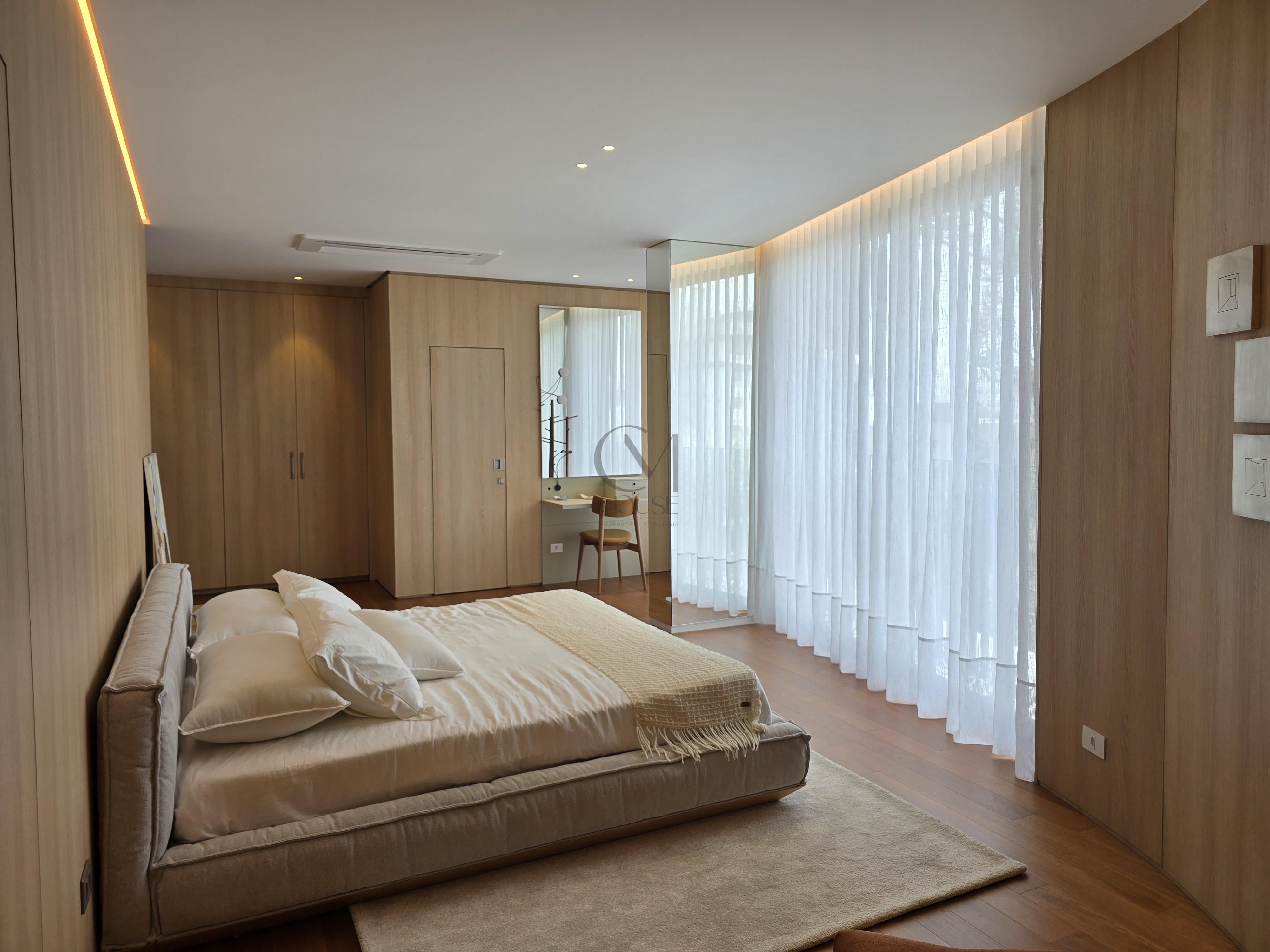 A planta original foi repensada com inteligência e bom gosto: um dos quartos foi estrategicamente suprimido e integrado à suíte master, criando um verdadeiro refúgio privativo. Esta integração ampliou significativamente o espaço, permitindo a criação de um closet generoso e uma suíte principal que respira luxo e exclusividade.